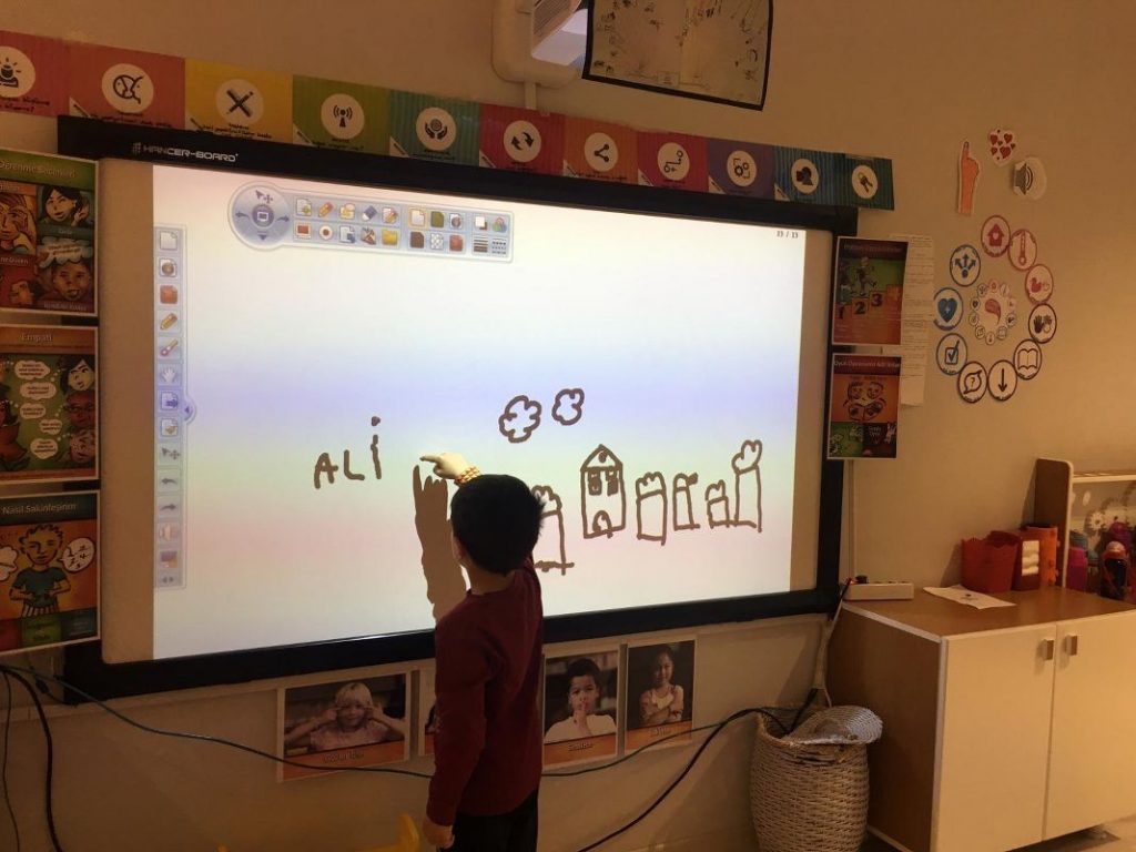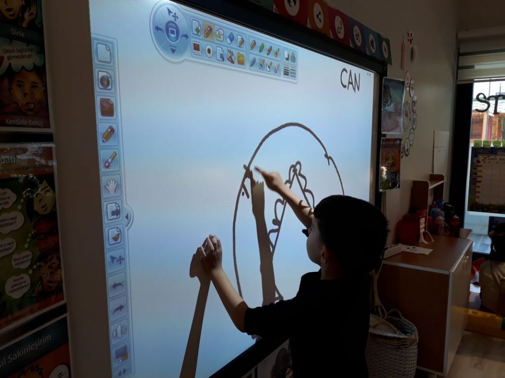 Okul öncesi öğrencilerimiz ‘’Üretim’’ teması kapsamında sanat ve teknolojiyi bir arada kullanabilecekleri keyifli bir çalışma gerçekleştirdiler. Sanatsal meslek deyince aklına ne geliyor, sanatsal mesleklerle teknoloji arasında nasıl bir ilişki vardır? sorularına cevap aradılar. Ardından her öğrenci akıllı tahtayı kullanarak özgün bir şekilde resim çalışması gerçekleştirdi. Kaydedilen resimlerin yazıcıdan çıktısı alınarak öğrencilerle birlikte incelendi. Tahtaya çizdikleri resimle yazıcıdan çıkan resmin boyutlarının farklı olduğunu keşfettiler ve ardından bu resimleri renklendirerek etkinliği sonlandırdılar.
