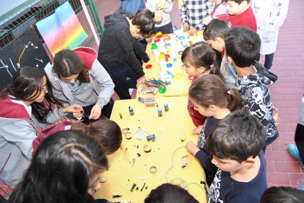 Okulumuzda her sene gerçekleştirilen “Fen Bilimleri Atölyeleri” bu yıl da öğrenciler tarafından büyük ilgi gördü. Atölyede 5, 6 ve 7.sınıflar kendi emekleriyle ortaya çıkardıkları projelerini arkadaşlarıyla paylaştılar. Şenliğe katılan öğrenciler; sergiyi gezme, projeleri inceleme fırsatı buldular. Ayrıca fizik atölyesinde ‘’Elektrikli Böcek’’, kimya atölyesinde ‘’Fil Dişi Deneyi ve Manyetik Kum Deneyleri’’, biyoloji atölyesinde ‘’Renkli Karanfil Deneyi’’ etkinliklerini yaparak keyifli dakikalar geçirdiler. Bilim Haftası olması sebebiyle okulumuz 7-B öğrencileri tarafından Aziz Sancar’ın hayatı ve çalışmalarının yer aldığı bir köşe hazırlandı. Bilim Haftası kapsamında düzenlenen etkinliklerden biri olan ‘’Evvel Zaman İçinde’’ adlı bilim tiyatrosu izleyenlerden büyük alkış aldı. Öğretmenlerin rehberliğinde 6 ve 7. sınıf öğrencilerimizin hazırlayıp sahnelediği oyun, izleyenlere keyifli anlar yaşattı.