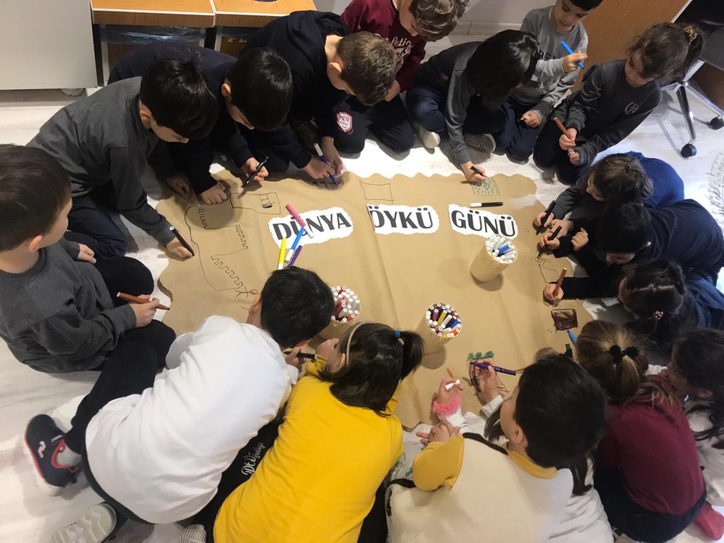 Okulumuz 14 Şubat Dünya Öykü Günü’nü “İnsan, öyküyle başlar.” diyerek her yıl olduğu gibi bu yıl da çeşitli etkinliklerle kutladı. Türkçe öğretmenlerimizin düzenlediği etkinlikler öğrencilerimizce ilgiyle karşılandı. Dünya Öykü Günü’nün önemine dikkat çekmek için 5. sınıf öğrencilerimizden oluşan bir grup, okul öncesi ve ilkokul sınıflarını ziyaret ederek seçtikleri öyküleri sınıflarında minik arkadaşlarına okudular. Öyküleri ilgi ve heyecanla dinleyen okul öncesi ve ilkokul öğrencilerimiz öykülerle ilgili hayallerini resmettiler.