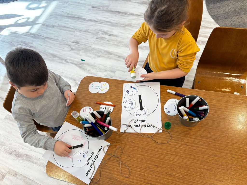 Okul öncesi 5 yaş grubu öğrencilerimiz İngilizce dersinde bazı duyguların isimlerini öğrendiler. “Feelings” ünitesi kapsamında öncelikle kendi hislerini ifade eden yüzler oluşturdular. Daha sonra bu duyguları onlara verilen çarklara yapıştıran öğrencilerimiz gün içinde yaşadıkları duygu değişimlerini bu çark üzerinden göstererek tekrar etme fırsatı buldular.