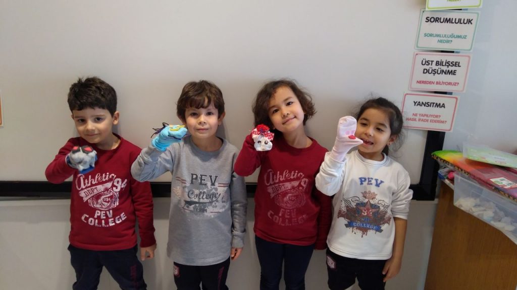 Okul öncesi öğrencilerimiz, üretim teması kapsamında evlerinden getirdikleri kullanılmayan çorapları farklı alanlarda değerlendirmek için bir çalışma yaptılar. Okul öncesi A, B, C şubesi öğrencileri çorapları, farklı materyaller kullanarak el kuklası olacak biçimde tasarladılar. Tamamlanan kuklaları arkadaşlarına tanıtarak oynattılar. Öğrencilerimizin kullanılmayan eşyaları yeniden üretmenin önemini kavradıkları bu çalışma, üretici olma bilincini kazandırması yönünden de önemliydi. Etkinlik, üretilen kuklalarla yapılan kukla gösterisi ile sonlandırıldı.