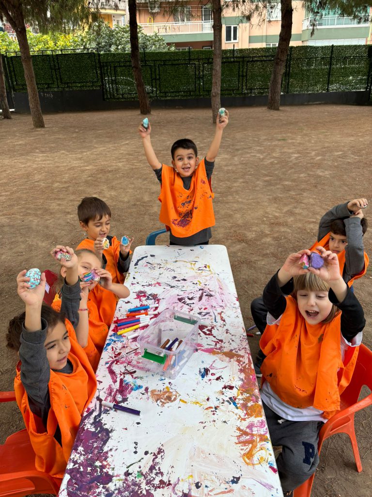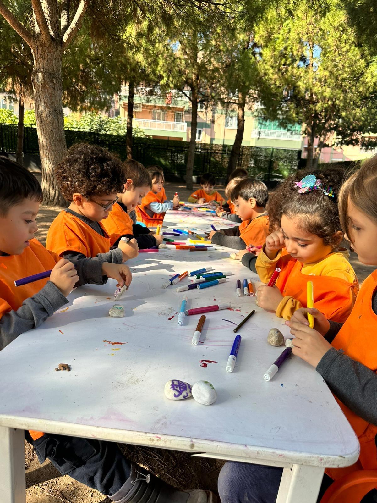 Okul öncesi öğrencilerimiz bu hafta doğa atölyemizde doğa ve hayal gücünü buluşturdu. Minik eller taşlara dokundu, renklerle konuştu. Her taş bir hikâyeye dönüştü; çocuklar kendi masal kahramanlarını taşların üzerine işleyerek iç dünyalarından yepyeni öyküler doğurdular. Her biri kendi masalının yazarı, anlatıcısı ve ressamı oldu.