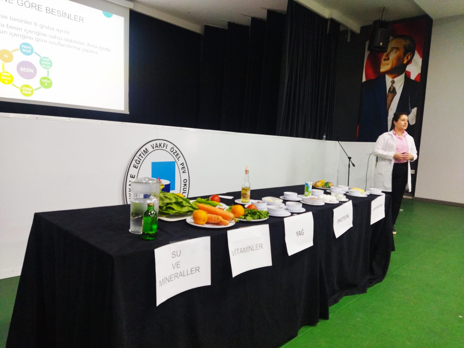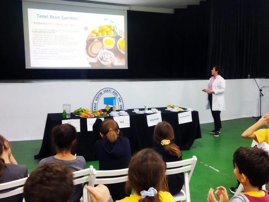 Okul konferans salonunda yapılan etkinlikte öğrenciler, günlük beslenmede dikkat edilmesi gereken noktalar, besin gruplarının özellikleri ve dengeli beslenmenin önemi hakkında bilgi edindiler.