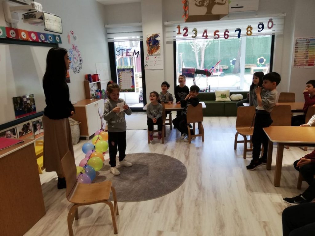 Okul Öncesi A, B ve C şubesi öğrencileri ‘’Okuma Yazmaya Hazırlık Dersi’’ kapsamında sesin önemi ve sesli harfler arasındaki ilişki üzerine farklı örnekler vererek sohbet ettiler. Öğrenciler ‘’Sesli Balon’’ oyununu oynamak için a, e, i, o ve u sesleriyle isimlendirilerek beş gruba ayrıldılar. Sınıf mevcudu kadar ipe dizilen ve içinde a, e, i, o ve u sesleriyle başlayan görsellerin bulunduğu balonları incelediler. Öğrenciler sırayla, seçtiği bir balonu patlatarak içinden çıkan görselin hangi sesle başladığına karar verdiler. Karar veren öğrenciler görselindeki sesle başlayan gruba görsellerini teslim ettiler. Ardından tüm balonlar patlatılana ve görseller gruplarla eşleştirilene kadar oyuna devam ettiler.
