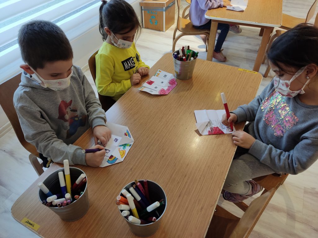 Okul Öncesi 6 yaş grubu öğrencilerimiz İngilizce dersinde aile üyelerini öğrenirken çeşitli oyunlar oynayıp farklı etkinlikler gerçekleştirdiler. Aile üyeleriyle ilgili videolar izleyip hikâye zamanı yapan öğrencilerimiz sonrasında origami tekniklerini kullanarak kağıttan bir ev hazırladılar. Oluşturdukları bu evin içine kendi aile bireylerini çizen öğrencilerimiz çalışmalarını arkadaşlarına anlatırken hem eğlenerek kelimeleri öğrendiler hem de yapıları tekrar etme fırsatı buldular.