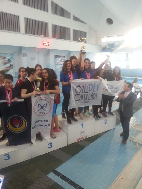 Özel PEV Ortaokul Yüzme Kız Takımımız aldıkları 4X100m Serbest Bayrak Kız Takımı Denizli Birinciliği, 4X200m Serbest Bayrak Kız Takımı Denizli Birinciliği ve 4X100m Karışık Bayrak Kız Takımı Denizli Birinciliği ile Denizli Birincisi olarak il dışında yapılacak bölge yarışlarına gitmeye hak kazandı.