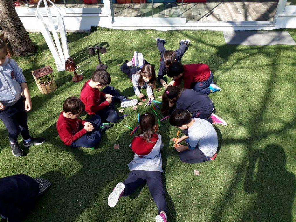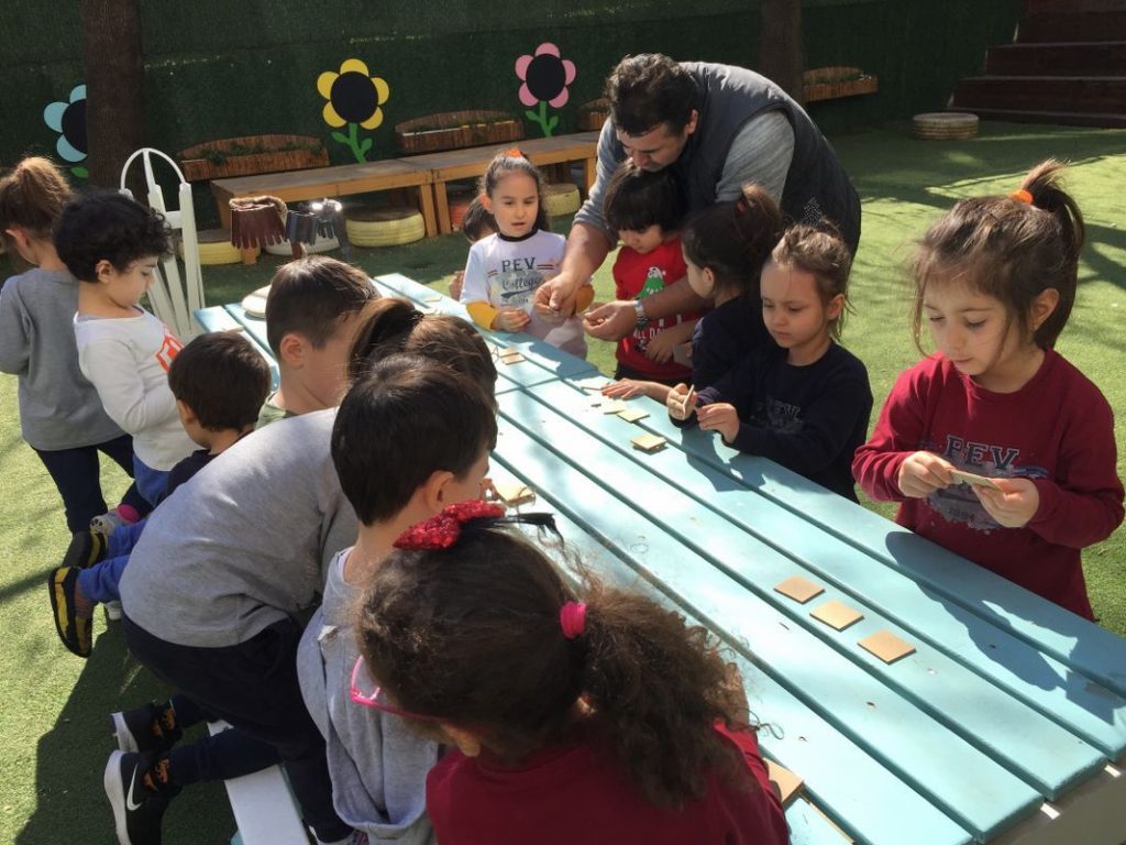 Okul öncesi öğrencilerimiz, ‘’Üretim’’’ teması kapsamında ahşaptan yapılan saksı, abajur, şemsiyelik, tabure gibi eşyaları inceleyerek üretilirken hangi aşamalardan geçtikleri üzerine sohbet ettiler. Öğrencilerimiz açık alanda ahşap plakaları zımparalamayı deneyimlediler. Ardından zımparaladıkları parçalara resimler çizerek kendi eşleştirme oyunlarını ürettiler. Çizdikleri resimleri birbirleriyle paylaşan öğrencilerimiz hazırladıkları eşleştirme oyununu keyifle oynadılar.