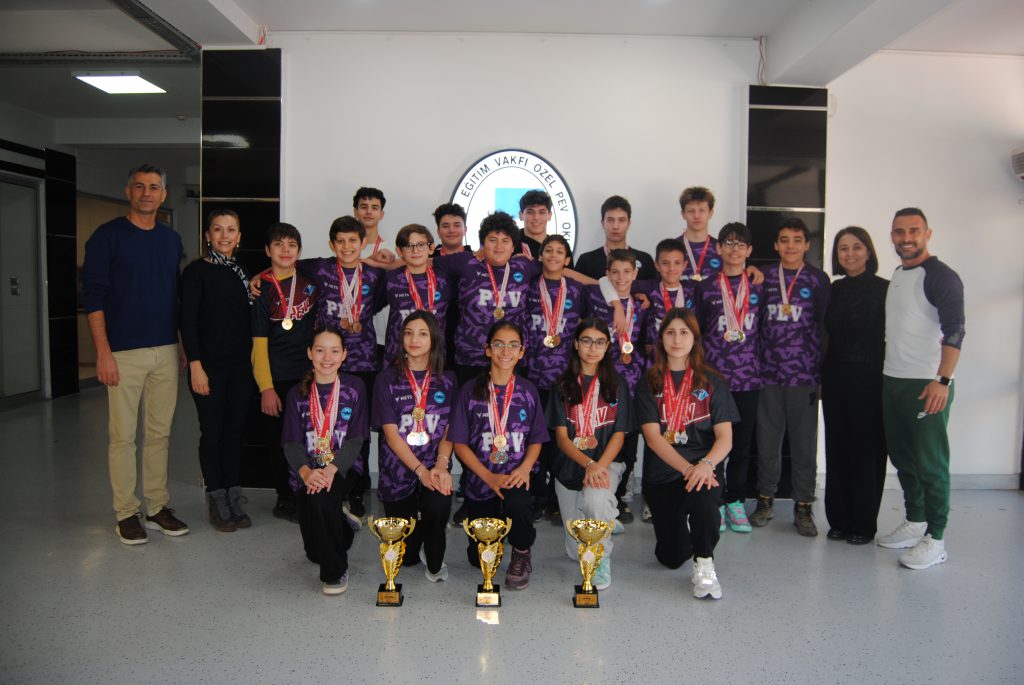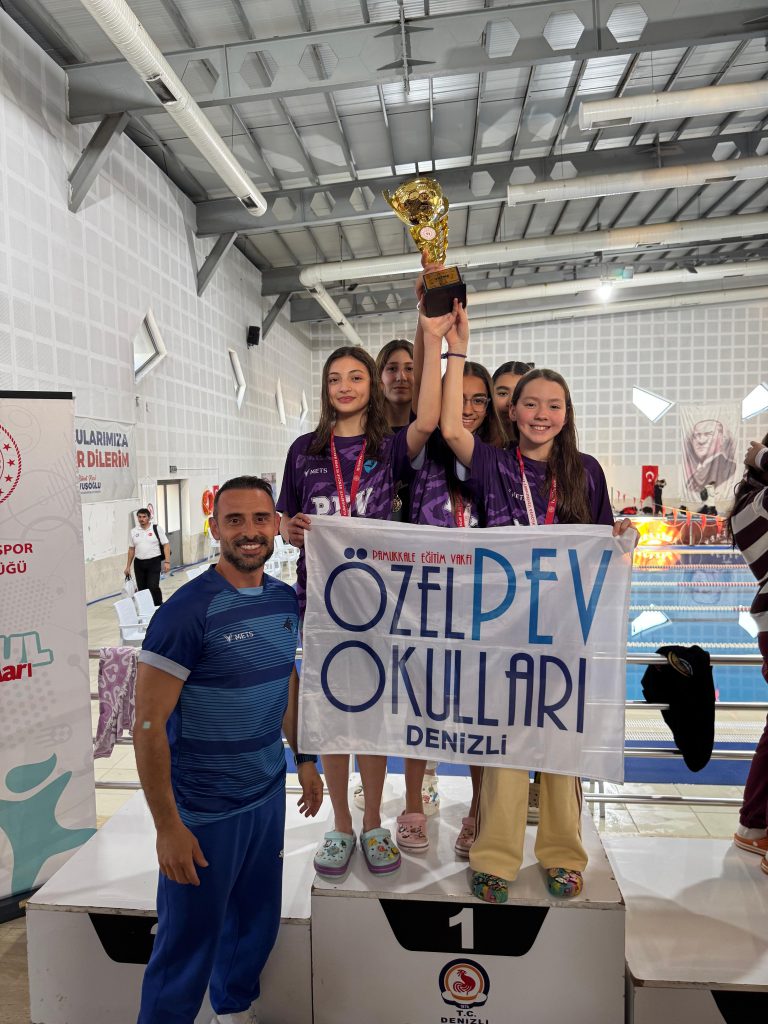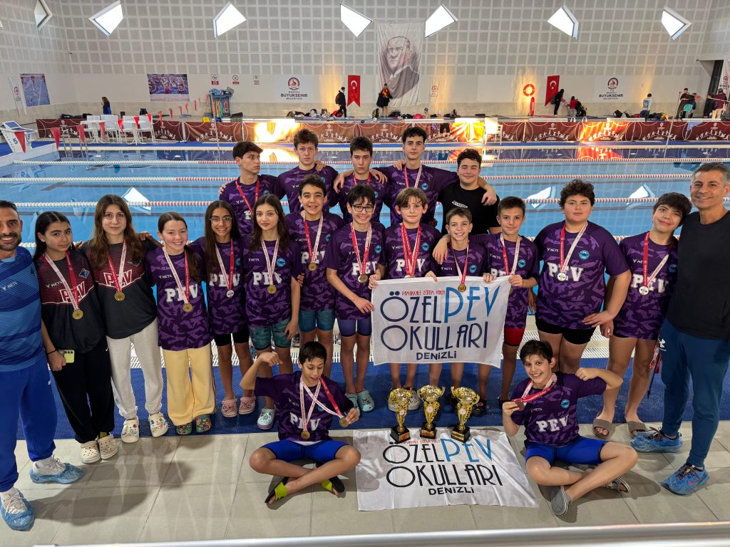 10-11-12 Aralık 2025 tarihlerinde Kayhan Yüzme Havuzunda Gençlik Spor İl Müdürlüğü tarafından düzenlenen Okul Sporları Yüzme Yıldızlar İl Birinciliği müsabakalarında Özel PEV Ortaokulu Yıldız Bayanlar takım yüzücülerimiz Derin Alya K., Selin Ö., Ela E., Feraye Y., Nildeniz Özgür B.’den oluşan Yıldız Bayanlar Takımımız 4x100m Karışık müsabakasında ikinci, 4x200m Serbest müsabakasında üçüncü, 4x100m Serbest müsabakasında üçüncü olarak Denizli birinciliğini elde ettiler!